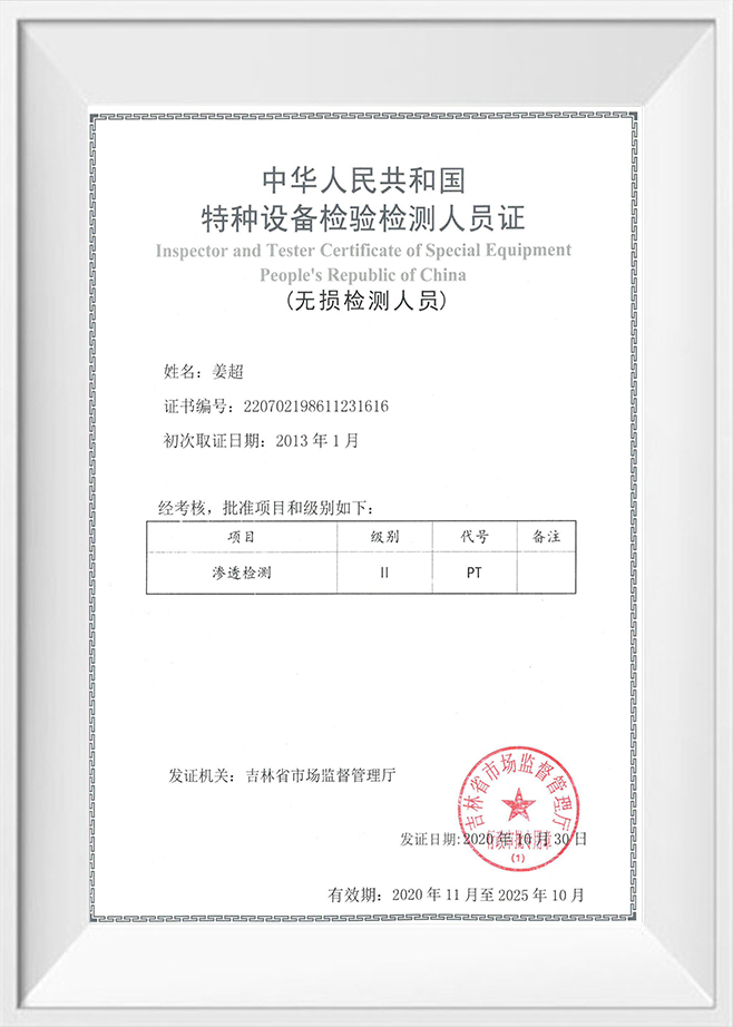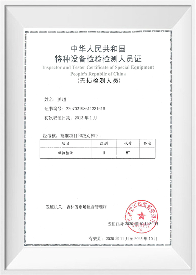 Certificat d'inspecteur et testeur d'équipement spécial République populaire de Chine